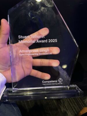 Amanpreet Singh (Sunny), one of Apex’s maintenance technicians and part of our team since 2018, was recently awarded New Zealand’s top maintenance engineering apprentice for 2025, taking out the prestigious Stuart Tolhurst Memorial Award.